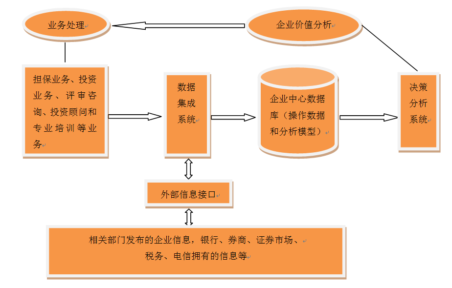 企業數據庫以企業中心數據庫為核心,還包括數據集成系統與決策分析系統。因此,企業數據庫的實施主要體現在企業業務和外部信息處理、企業數據集成系統、數據倉庫和決策分析系統四大部分。正如圖8-2所示,建立企業數據庫的目的最終體現在進行企業價值分析,以便更有效地開展業務上。