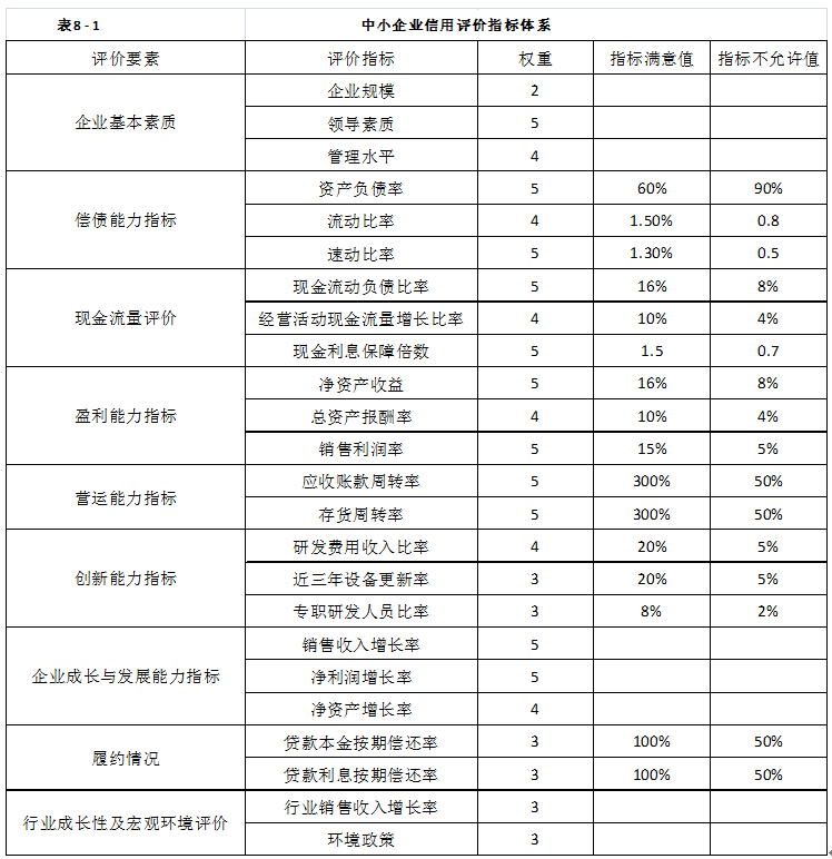 倉儲金融業務中,中小企業篩選的標準要根據國家對于中小型企業發展的指導思想,即“選擇重點,規范操作,總結經驗,翁不推進”與“支持發展與防范風險相結合;政府扶持與市場操作相結合;開展擔保與提高信用相結合”的三個原則要求,結合企業的實際情況對中小型企業進行篩選。倉儲金融業務是一項新業務,為有效規避風險,銀行對企業的審查相對嚴格,獲得批準者一般都是各項業務素質比較優良的企業。比如廣東發展銀行在審貨時,一般選取行業市場占有率位于前三位的企業,而且產品暢銷、價格穩定、流通性好,同時也考慮企業的財務狀況、實力、品牌知名度等,目的是控制好信貸風險。與傳統信貸業務的審查不同,倉儲金融業務對所服務的周末和小型企業的審核更強調企業的成長性,這涉及該企業的還款來源。此外,經營管理團隊、產品及其技術含量、市場等也是審查的重點。對中小型企業的信用評價指標體系如表8-1所示,評價的要素包括企業基本要素、賠償能力指標、現金流量評價、盈利能力指標、營運能力指標、創新能力指標、企業成長與發展能力指標、履約情況、行業成長性與宏觀環境評價。